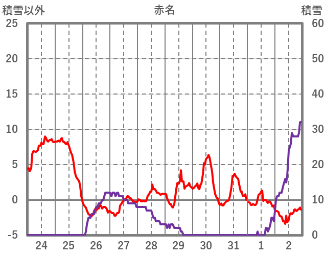 | 日 | 時 | 気温 | 降水 | 風向/風速 | 日照 | 積雪 | 降雪 |