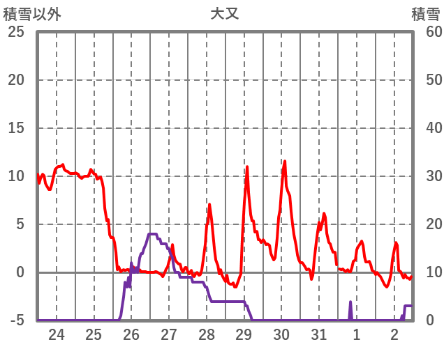 | 日 | 時 | 気温 | 降水 | 風向/風速 | 日照 | 積雪 | 降雪 |