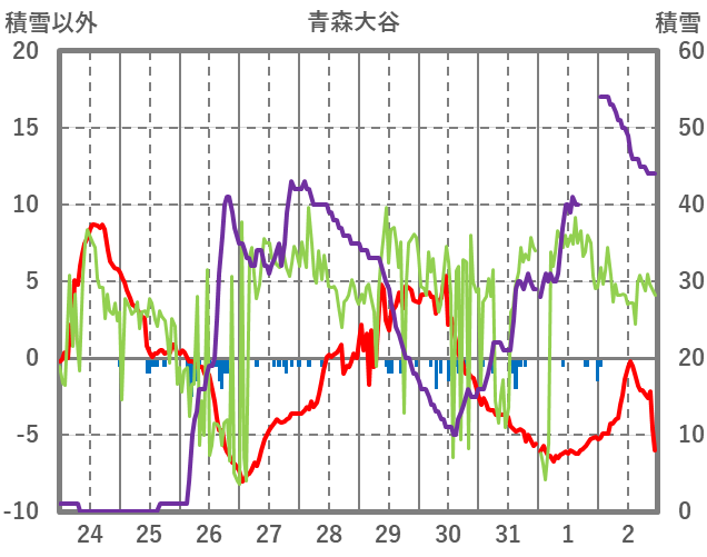 | 日 | 時 | 気温 | 降水 | 風向/風速 | 日照 | 積雪 | 降雪 |