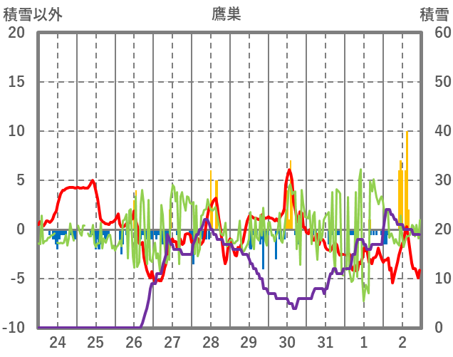 | 日 | 時 | 気温 | 降水 | 風向/風速 | 日照 | 積雪 | 降雪 |