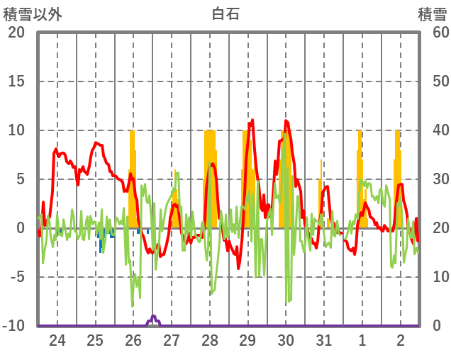 | 日 | 時 | 気温 | 降水 | 風向/風速 | 日照 | 積雪 | 降雪 |