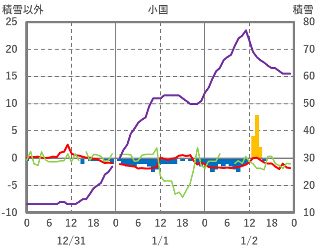 | 日 | 時 | 気温 | 降水 | 風向/風速 | 日照 | 積雪 | 降雪 |