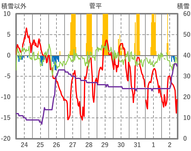 | 日 | 時 | 気温 | 降水 | 風向/風速 | 日照 | 積雪 | 降雪 |
