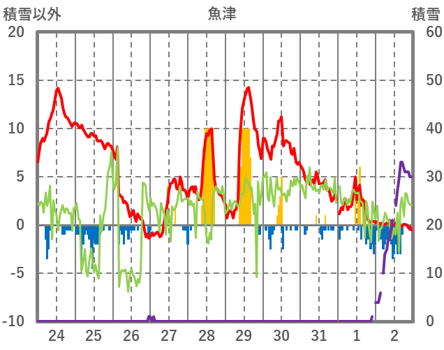 | 日 | 時 | 気温 | 降水 | 風向/風速 | 日照 | 積雪 | 降雪 |