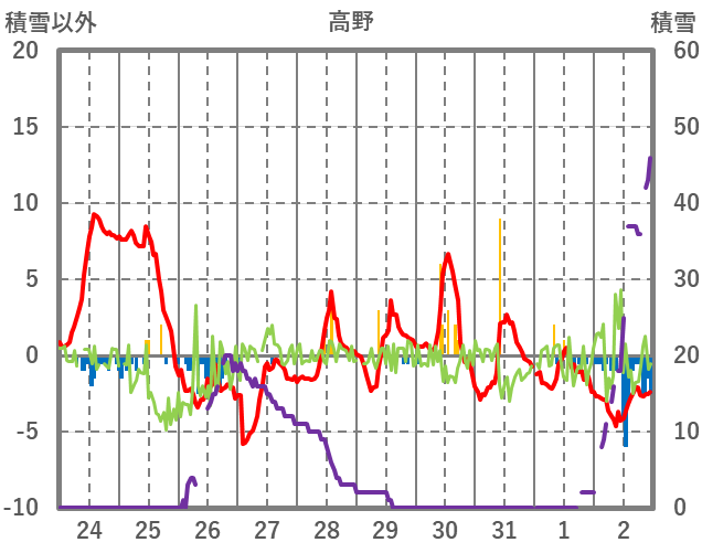 | 日 | 時 | 気温 | 降水 | 風向/風速 | 日照 | 積雪 | 降雪 |