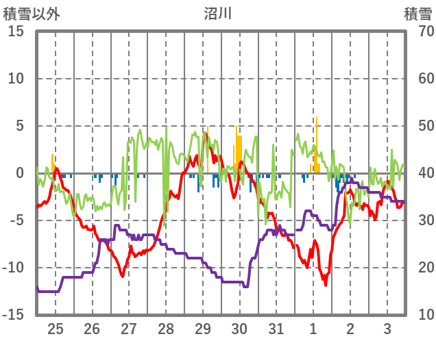 | 日 | 時 | 気温 | 降水 | 風向/風速 | 日照 | 積雪 | 降雪 |