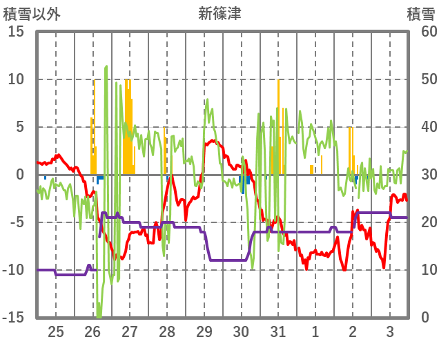 | 日 | 時 | 気温 | 降水 | 風向/風速 | 日照 | 積雪 | 降雪 |