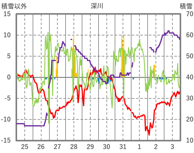 | 日 | 時 | 気温 | 降水 | 風向/風速 | 日照 | 積雪 | 降雪 |