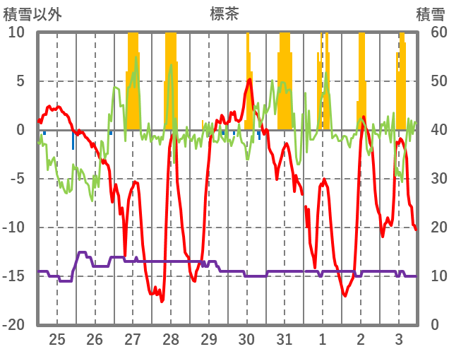 | 日 | 時 | 気温 | 降水 | 風向/風速 | 日照 | 積雪 | 降雪 |
