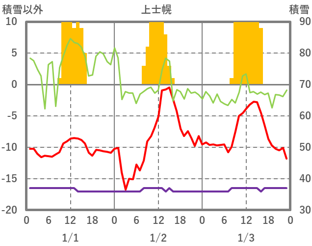 | 日 | 時 | 気温 | 降水 | 風向/風速 | 日照 | 積雪 | 降雪 |