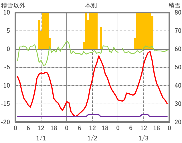 | 日 | 時 | 気温 | 降水 | 風向/風速 | 日照 | 積雪 | 降雪 |