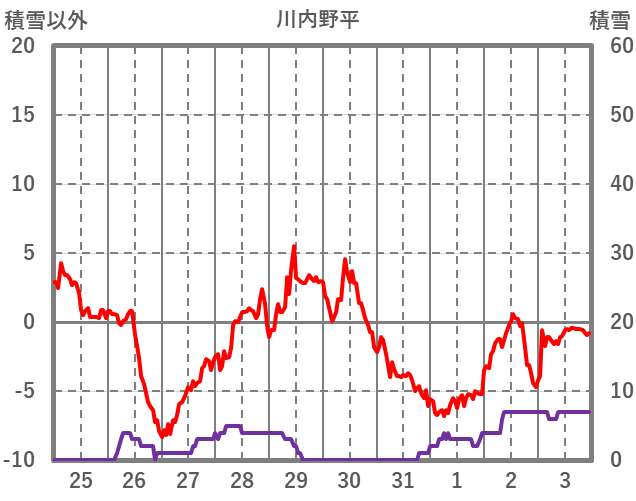 | 日 | 時 | 気温 | 降水 | 風向/風速 | 日照 | 積雪 | 降雪 |