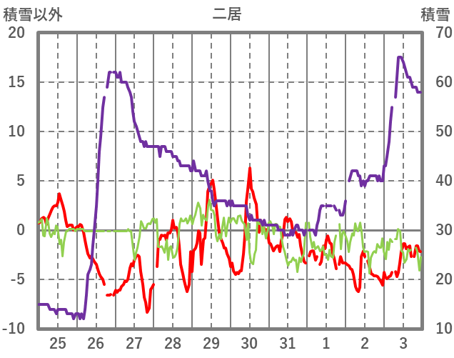 | 日 | 時 | 気温 | 降水 | 風向/風速 | 日照 | 積雪 | 降雪 |
