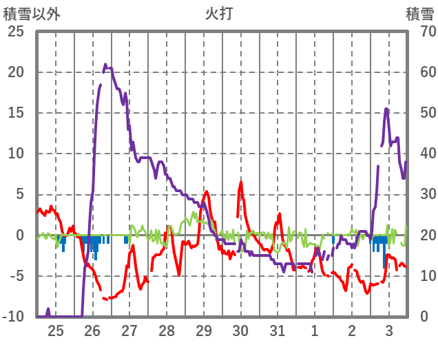 | 日 | 時 | 気温 | 降水 | 風向/風速 | 日照 | 積雪 | 降雪 |