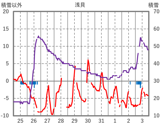 | 日 | 時 | 気温 | 降水 | 風向/風速 | 日照 | 積雪 | 降雪 |