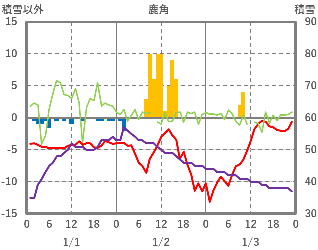 | 日 | 時 | 気温 | 降水 | 風向/風速 | 日照 | 積雪 | 降雪 |