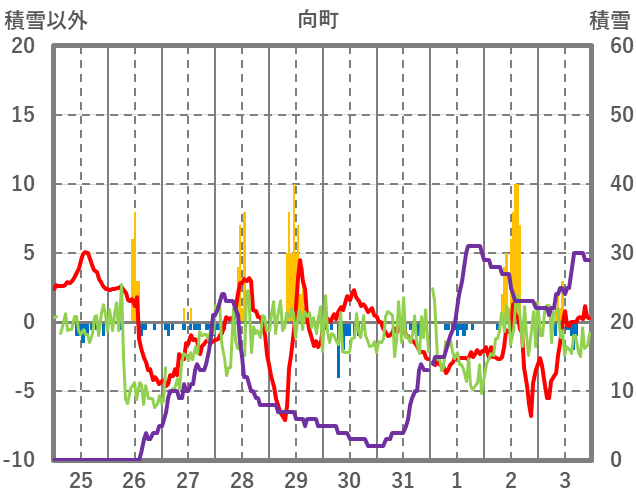 | 日 | 時 | 気温 | 降水 | 風向/風速 | 日照 | 積雪 | 降雪 |