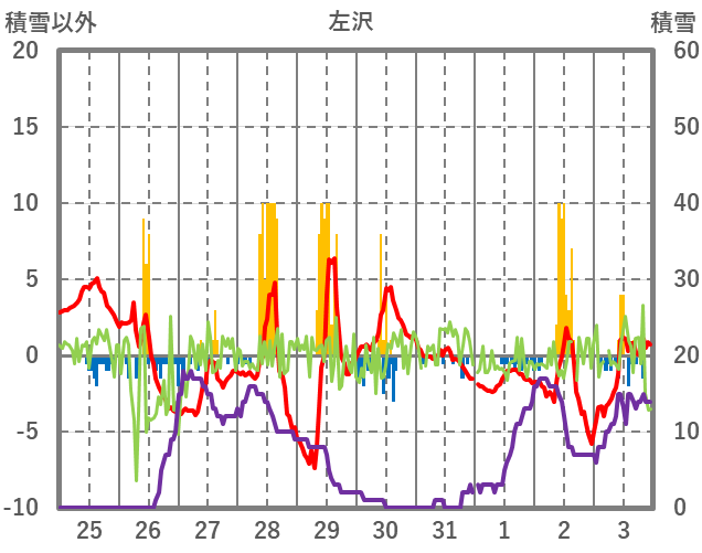 | 日 | 時 | 気温 | 降水 | 風向/風速 | 日照 | 積雪 | 降雪 |