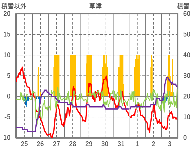 | 日 | 時 | 気温 | 降水 | 風向/風速 | 日照 | 積雪 | 降雪 |