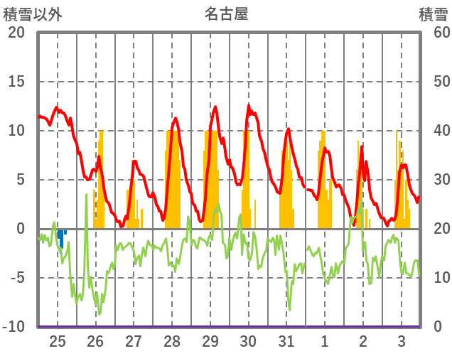 | 日 | 時 | 気温 | 降水 | 風向/風速 | 日照 | 積雪 | 降雪 |