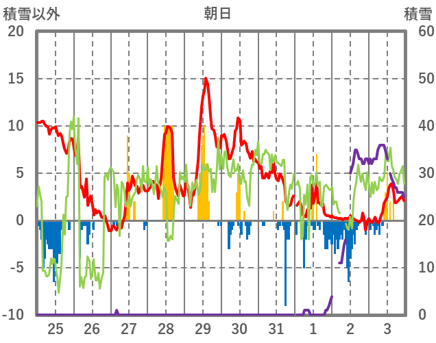 | 日 | 時 | 気温 | 降水 | 風向/風速 | 日照 | 積雪 | 降雪 |