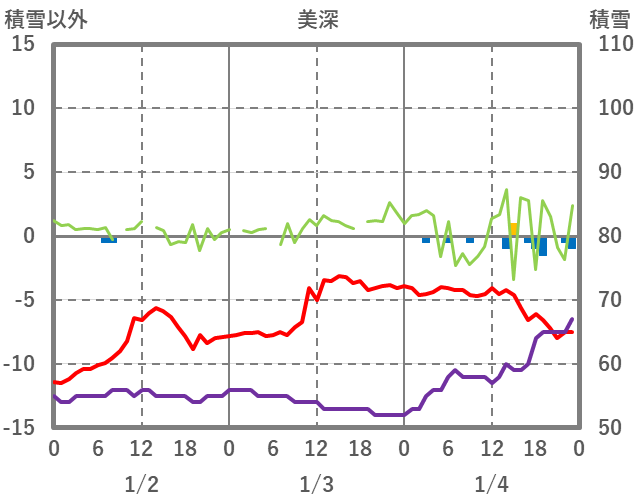 | 日 | 時 | 気温 | 降水 | 風向/風速 | 日照 | 積雪 | 降雪 |