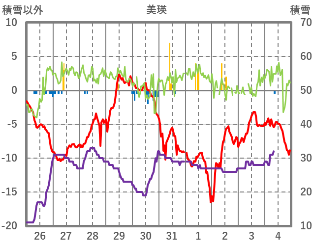 | 日 | 時 | 気温 | 降水 | 風向/風速 | 日照 | 積雪 | 降雪 |
