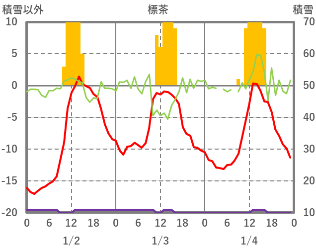 | 日 | 時 | 気温 | 降水 | 風向/風速 | 日照 | 積雪 | 降雪 |