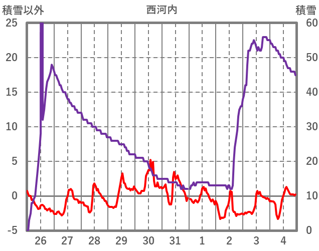 | 日 | 時 | 気温 | 降水 | 風向/風速 | 日照 | 積雪 | 降雪 |