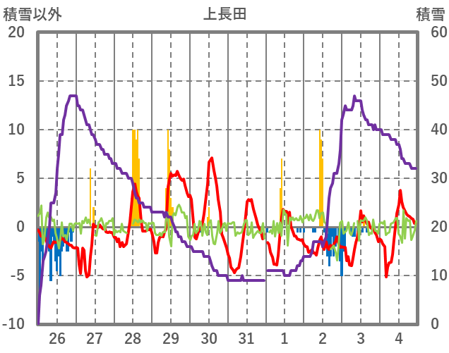 | 日 | 時 | 気温 | 降水 | 風向/風速 | 日照 | 積雪 | 降雪 |