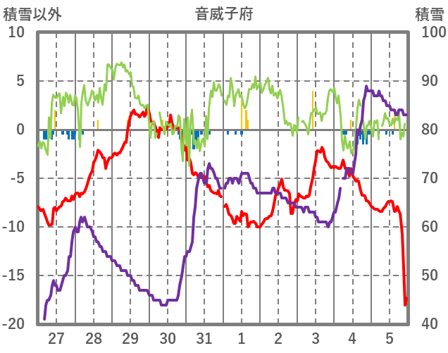 | 日 | 時 | 気温 | 降水 | 風向/風速 | 日照 | 積雪 | 降雪 |