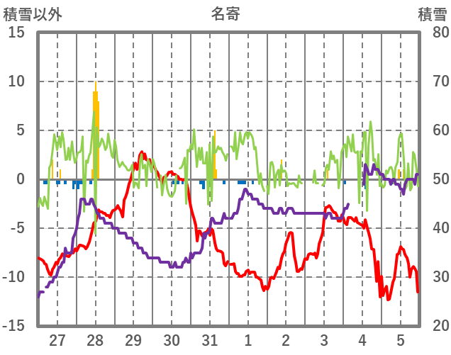 | 日 | 時 | 気温 | 降水 | 風向/風速 | 日照 | 積雪 | 降雪 |