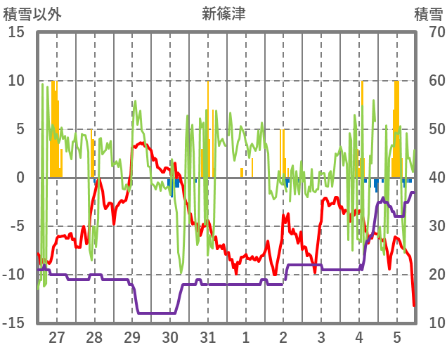| 日 | 時 | 気温 | 降水 | 風向/風速 | 日照 | 積雪 | 降雪 |