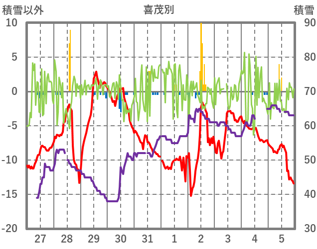 | 日 | 時 | 気温 | 降水 | 風向/風速 | 日照 | 積雪 | 降雪 |