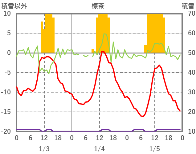 | 日 | 時 | 気温 | 降水 | 風向/風速 | 日照 | 積雪 | 降雪 |