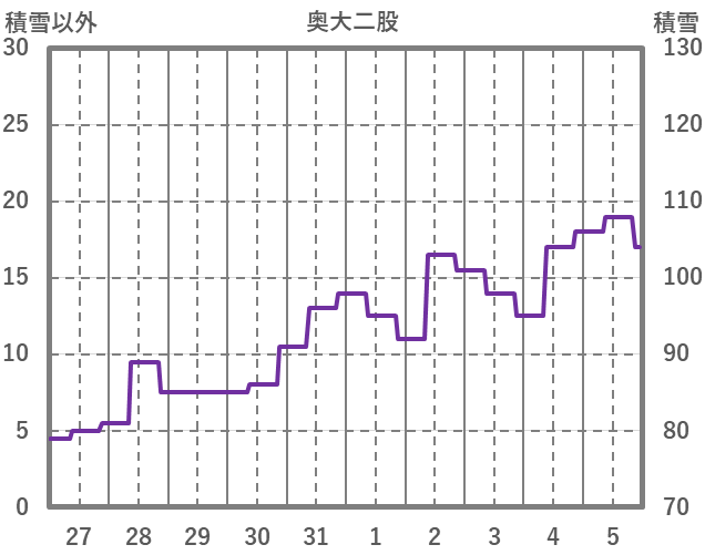 | 日 | 時 | 気温 | 降水 | 風向/風速 | 日照 | 積雪 | 降雪 |