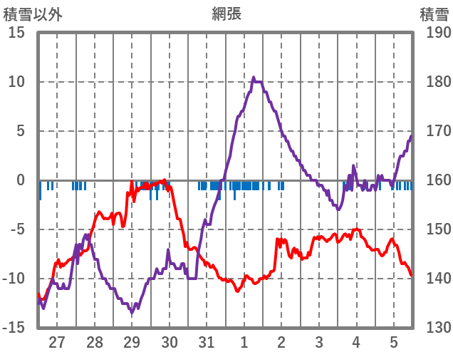 | 日 | 時 | 気温 | 降水 | 風向/風速 | 日照 | 積雪 | 降雪 |