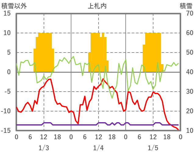 | 日 | 時 | 気温 | 降水 | 風向/風速 | 日照 | 積雪 | 降雪 |