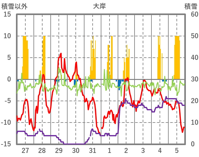 | 日 | 時 | 気温 | 降水 | 風向/風速 | 日照 | 積雪 | 降雪 |