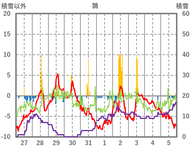 | 日 | 時 | 気温 | 降水 | 風向/風速 | 日照 | 積雪 | 降雪 |