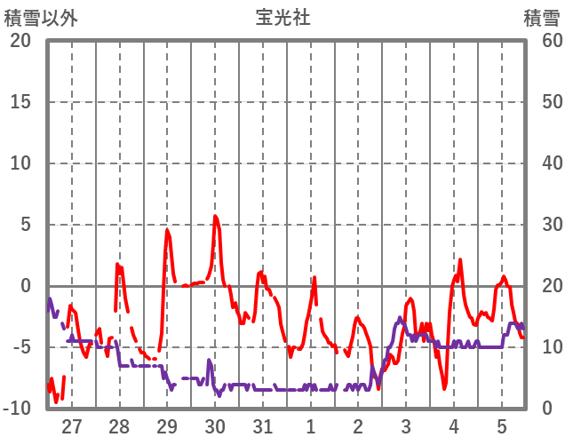 | 日 | 時 | 気温 | 降水 | 風向/風速 | 日照 | 積雪 | 降雪 |