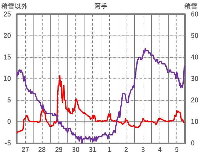 | 日 | 時 | 気温 | 降水 | 風向/風速 | 日照 | 積雪 | 降雪 |