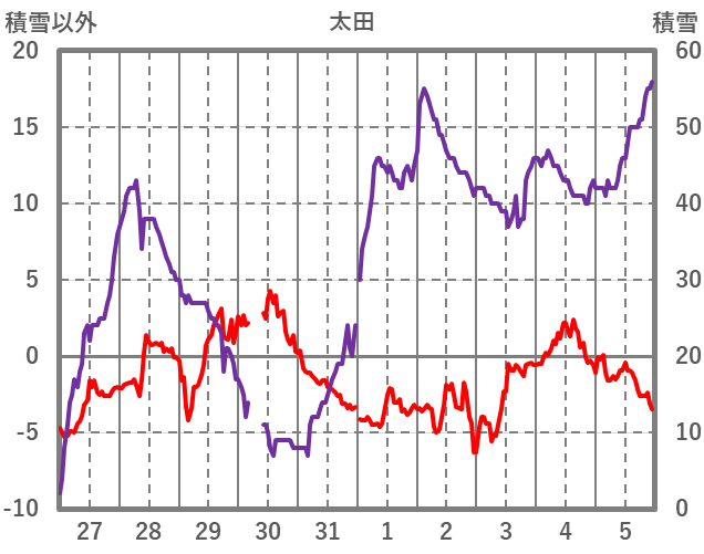 | 日 | 時 | 気温 | 降水 | 風向/風速 | 日照 | 積雪 | 降雪 |