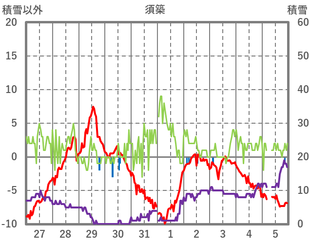 | 日 | 時 | 気温 | 降水 | 風向/風速 | 日照 | 積雪 | 降雪 |