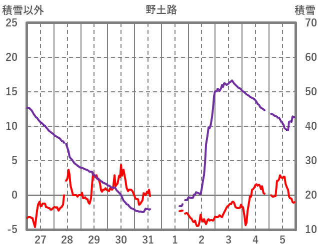 | 日 | 時 | 気温 | 降水 | 風向/風速 | 日照 | 積雪 | 降雪 |