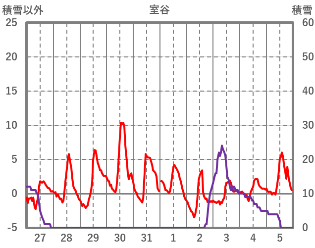 | 日 | 時 | 気温 | 降水 | 風向/風速 | 日照 | 積雪 | 降雪 |