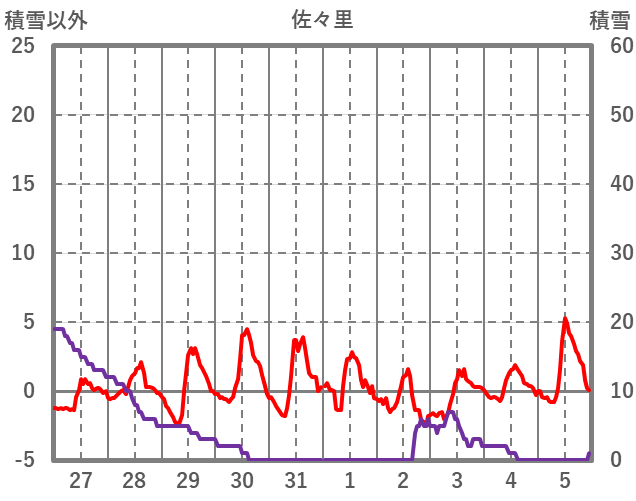 | 日 | 時 | 気温 | 降水 | 風向/風速 | 日照 | 積雪 | 降雪 |