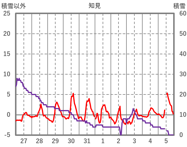 | 日 | 時 | 気温 | 降水 | 風向/風速 | 日照 | 積雪 | 降雪 |