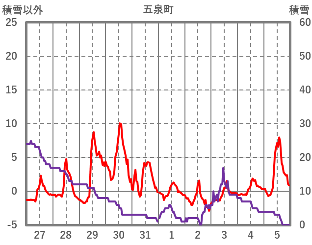 | 日 | 時 | 気温 | 降水 | 風向/風速 | 日照 | 積雪 | 降雪 |