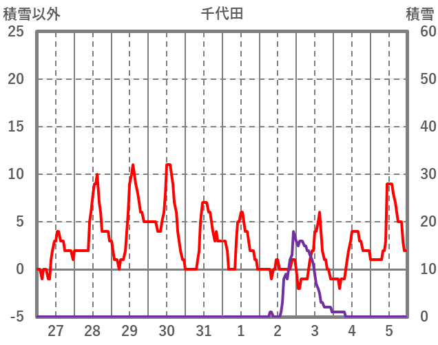 | 日 | 時 | 気温 | 降水 | 風向/風速 | 日照 | 積雪 | 降雪 |